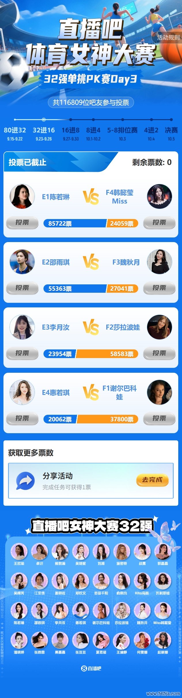 2025年『体育女神大赛』已进入32强单挑PK赛阶段,出回合赛Day3(E组、F组)结果如下: