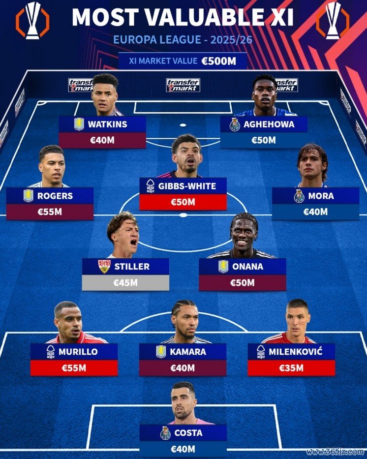 德转列本赛季欧联杯最贵阵:沃特金斯领衔维拉4人,英超占7席
