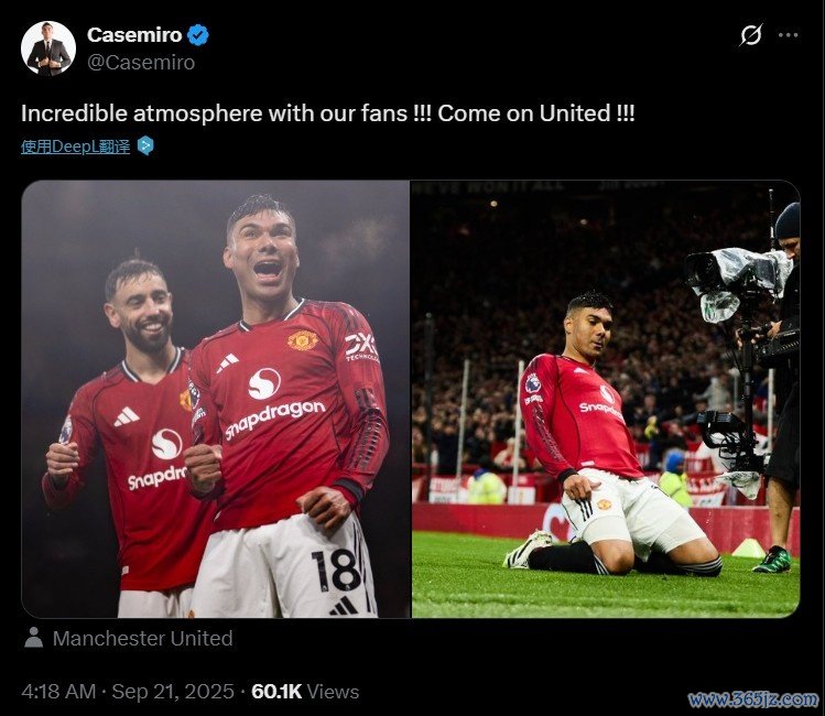 卡塞米罗晒出自己的赛场照意甲联赛积分榜, 乒乓球资讯并配文:球迷们营造的氛围简直太棒了!!!助威 曼联!!!