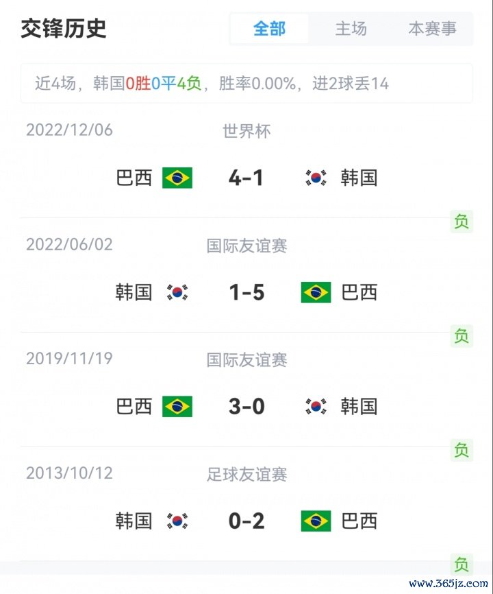韩国FIFA排名第23,巴西FIFA排名第6。双方上次交手是2022年世界杯赛 出回合赛,巴西4-1大胜韩国。