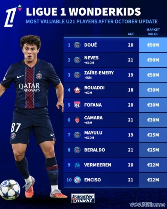10月11日讯 德国转会市场更新了法甲球员最新身价情况,在U21球员中,杜埃和若昂-内维斯以9000万欧并列榜首,排名前10的球员中有5名都来自巴黎圣日耳曼。